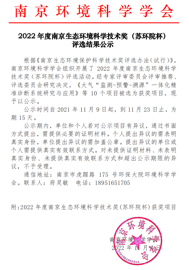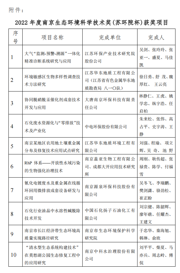 2022年度南京生态环境科学技术奖(苏环院杯)评选结果公示