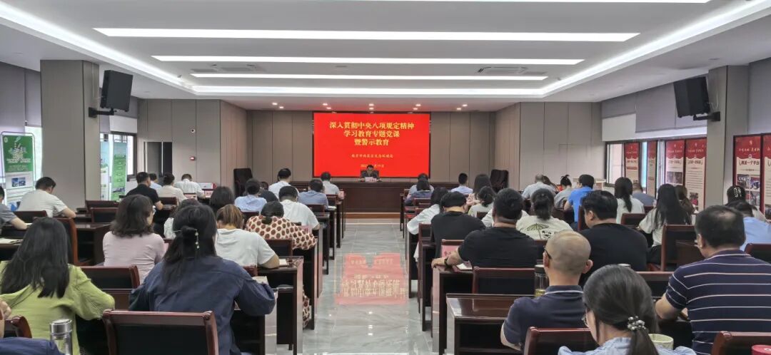 为扎实推进深入贯彻中央八项规定精神学习教育走深走实,切实增强党员干部纪律意识、规矩意识,筑牢拒腐防变思想防线,6月19日,雨花台生态环境局党组书记、局长许颐欣以“锲而不舍落实中央八项规定精神,锻造新时代环保铁军过硬作风”为主题,为全局党员干部讲授了一堂深刻而务实的专题党课。全局全体党员干部参加会议。