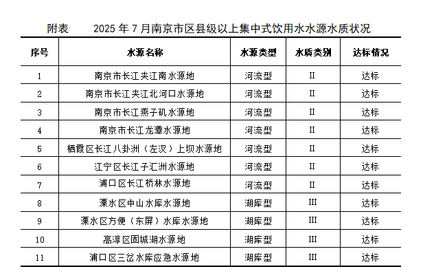 2025年7月,江苏省南京环境监测中心监测11个区县级以上在用集中式生活饮用水水源,均属于地表水水源(河流型7个,湖库型4个)。