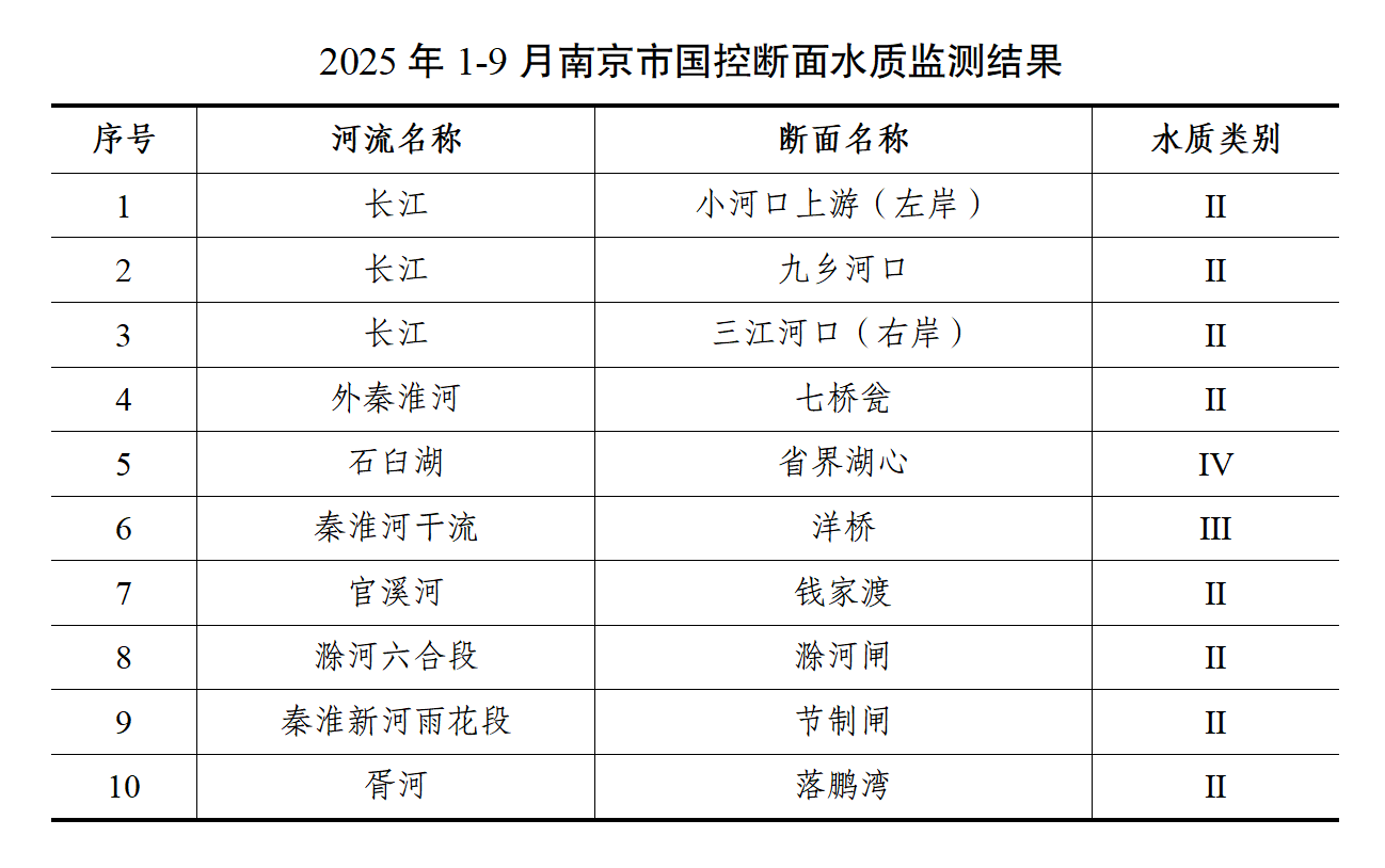 2025年1—9月,赌博网站列入“十四五”水环境质量考核的10个国控断面,Ⅰ~Ⅲ类断面占比90%。赌博网站国控断面水质监测结果如下: