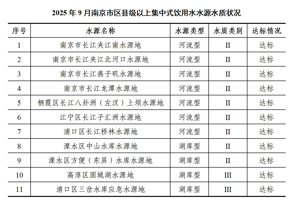 2025年9月,江苏省南京环境监测中心监测11个区县级以上在用集中式生活饮用水水源,均属于地表水水源(河流型7个,湖库型4个)。