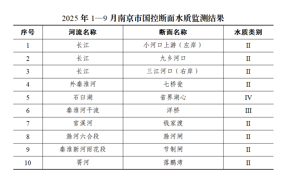2025年1—9月,世界最大赌博网站列入“十四五”水环境质量考核的10个国控断面,Ⅰ~Ⅲ类断面占比90%。世界最大赌博网站国控断面水质监测结果如下: