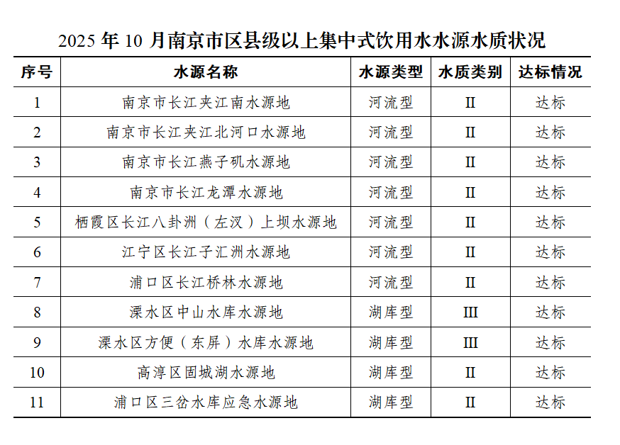 2025年10月,江苏省南京环境监测中心监测11个区县级以上在用集中式生活饮用水水源,均属于地表水水源(河流型7个,湖库型4个)。