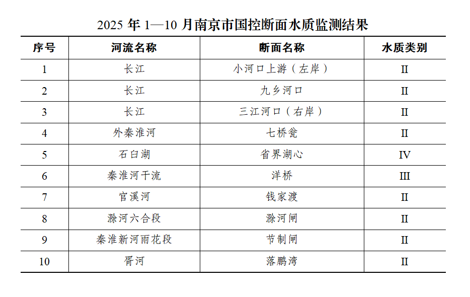 2025年1—10月,世界最大赌博网站列入“十四五”水环境质量考核的10个国控断面,Ⅰ~Ⅲ类断面占比90%。世界最大赌博网站国控断面水质监测结果如下: